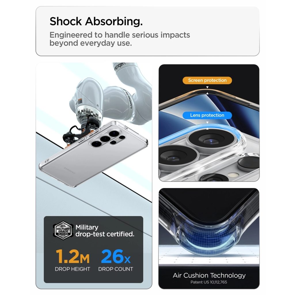 Die Marke Spigen gehört zu den führenden Herstellern von Mobilfunkzubehör. Eine Hülle, die minimalistisches Design mit Schutz auf höchstem Niveau kombiniert. Hergestellt aus strapazierfähigem und flexiblem TPU-Material, das das gesamte Gerät sicher umschließt und hervorragende Stoßdämpfung bietet. Die Ultra Hybrid wurde getestet und erhielt die Zertifizierung MIL STD 810G-516.6, was bedeutet, dass sie 26-mal aus einer Höhe von 2 Metern gefallen ist.