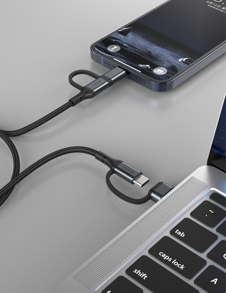 Mit drei verschiedenen Anschlüssen – USB-C, USB-A und Lightning – können Sie alle Ihre Geräte aufladen und Daten übertragen. Ein Kabel, alles unter Kontrolle!