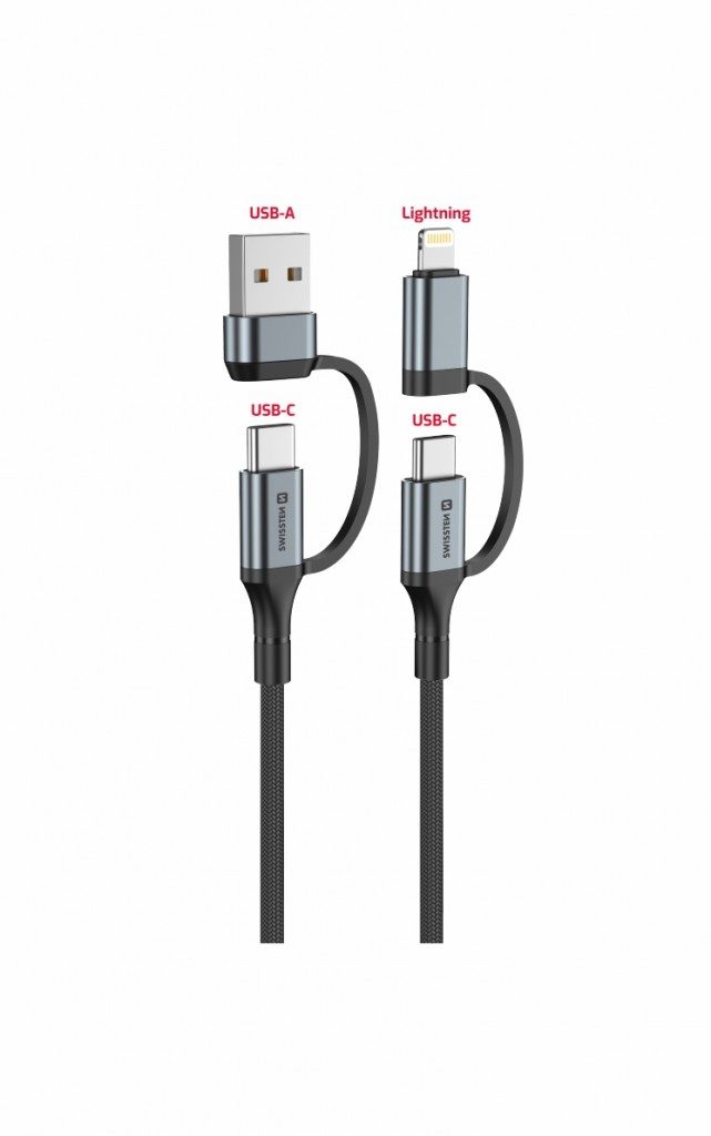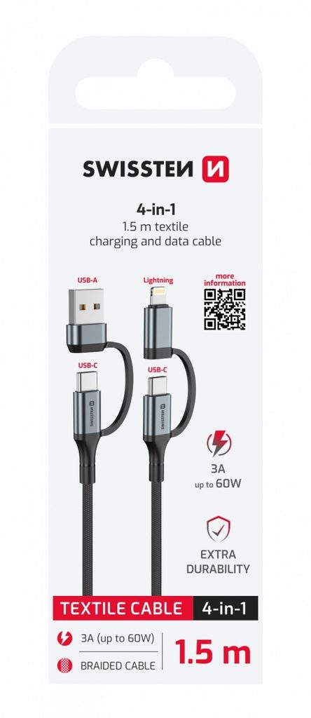 Entdecken Sie den neuen Standard beim Laden mit dem Swissten 4in1 Datenkabel! Dank universellem Design und hoher Widerstandsfähigkeit wird es zum unverzichtbaren Begleiter zu Hause, im Büro und unterwegs.